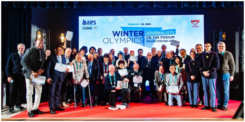 Alberto Tomba, IOC vice president Nawal el Moutawakel, Paul Tergat, honorary IOC member Manuela Di Centa, Claudia Giordani, and Maria Rosa Quario presented awards to journalists who have participated in more than 10 Olympic Games during Journalist on the Podium ceremony held at the Teulié Military School in Milan. Over a thousand Games were covered, representing decades of stories, images, and reports that have illustrated sports to the world. The event was organized and promoted by AIPS, the International Sports Press Association.