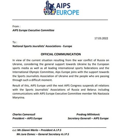 Result of this, AIPS Europe until the next AIPS Congress suspends all relations with the Sports Journalists' Associations of Russia and Belarus including communications with AIPS Europe Executive Committee member Ms Nastassia Marynina.