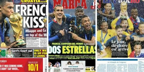 Na naslovnicama svjetskih sportskih medija, naravno, prevladavaju fotografije francuskog slavlja. Genijalan naslov ima talijanski Corriere dello Sport: 'Deschamps Elysees'.