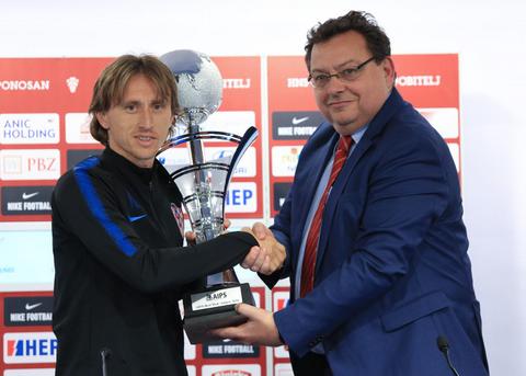 Modriću je nagradu na stadionu u Maksimiru u Zagrebu na konferenciji za novinare uoči kvalifikacijske utakmice za EP protiv Azerbajdžana predao rizničar i v.d. glavni tajnik AIPS-a, predsjednik Hrvatskog zbora sportskih novinara (HZSN) Jura Ozmec.