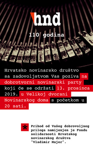 Tradicionalni novinarski party HND-a čiji je prihod namijenjen Fondu solidarnosti „Vladimir Majer“ održati će se u petak, 13. prosinca 2019. s počertkom u 20 sati u Velikoj dvorani Novinarskog doma (Perkovčeva 2, Zagreb).