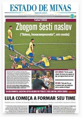 ESTADIO DE MINAS Svima je jasno koliku je veliku bol u Brazilu uzrokovao poraz njihove reprezentacije od Hrvatske, u četvrtfinalu Svjetskog prvenstva u Katru. Svatko se tamo s tom boli nosi na svoj način, no jedan od originalnih je onaj uredništva dnevnih novina Estadio de Minas. Naime, oni su na svoju naslovnicu udarni naslov na napisali na hrvatskom jeziku: "Zbogom šesti naslov", napisano je preko fotografije tužnih brazilskih nogometaša, gdje je tek u zagradi napisan prijevod na portugalskom jeziku.