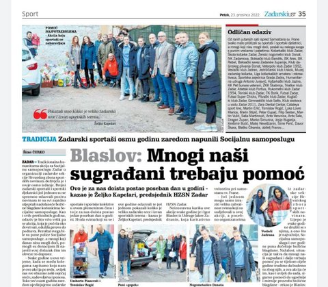 - Još jednom mogu samo izraziti veliku zahvalnost svima koji su sudjelovali u ovoj akciji, a posebno organizatorima iz zadarske sekcije Hrvatskog zbora sportskih novinara. Lijepo je svake godine družiti se s njima, a ono što je najvažnije, Socijalna samoposluga i ove godine puna dočekuje božićne blagdane. Nažalost, situacija je takva da mnogi naši sugrađani i dalje trebaju pomoć pa se tijekom cijele godine trudimo da budemo tu zbog njih, a ova akcija će im, kao i uvijek do sada, sigurno pomoći da ugodnije i mirnije provedu božićne blagdane. – rekao je Blaslov.