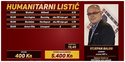 - Dakle, ukupan tečaj je 13,45, potencijalni dobitak 5.400 kuna, a bude li ga, u ove Božićne dane nitko nije u većoj potrebi nego djeca bez roditeljske skrbi - ističe Balog.