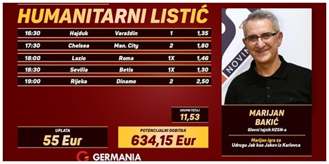 Ukupan tečaj na ovih pet parova je 11,53, a bude li dobitan, Germania će 634,15 eura prema Bakićevoj želji donirati Udruzi Jak kao Jakov iz Karlovca, humanitarnoj udruzi za pomoć djeci oboljeloj od malignih bolesti i njihovim obiteljima.