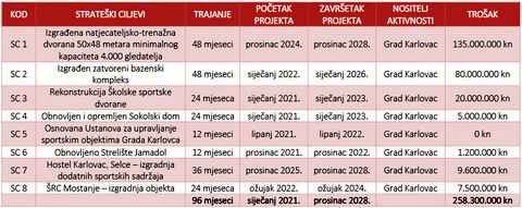 Među najbitnijim infrastrukturnim projektima je i izgradnja dodatnih sportskih sadržaja u Hostelu Karlovac u Selcu. Prema Strategiji, ona bi trebala početi u prosincu ove godine, a hoće li, ovisi o rješavanju jednog od najvećih hrvatskih problema, koji obično koči brojne projekte – pogađate, imovinsko-pravnih odnosa. Izgradnja Športsko-rekreacijskog centra Mostanje je u tijeku. Radovi su, u odnosu na termin predviđen Strategijom, kasnili dvije godine i započeli su čim su osigurana financijska sredstva.