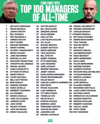 Britanski magazin FourFourTwo objavio je popis 100 najboljih nogometnih trenera svih vremena, a na vrh te prestižne liste ponovno je zasjeo legendarni Sir Alex Ferguson. Ovaj škotski stručnjak najveći dio svoje bogate karijere, čak 27 godina, proveo je na klupi Manchester Uniteda, s kojim je osvojio čak 13 naslova engleskog prvaka te dvaput slavio u Ligi prvaka. Prije toga ostvario je značajne uspjehe i u domovini, s Aberdeenom je tri puta bio prvak Škotske te osvojio Kup pobjednika kupova, a s manje poznatim St. Mirrenom također je došao do naslova.