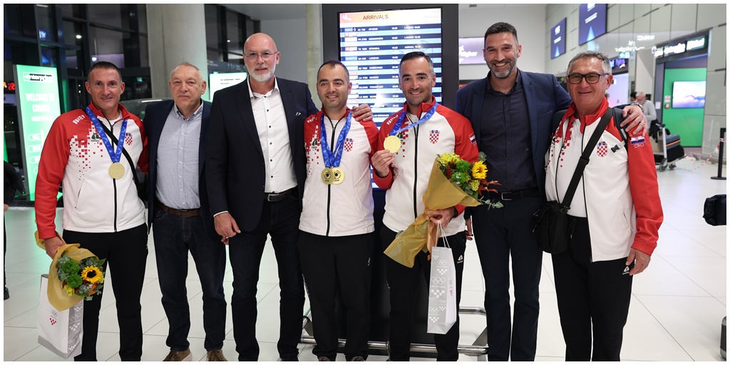 U zračnoj luci u Zagrebu dočekani zlatni hrvatski strijelci, svjetski prvaci u trapu braća Glasnović i Giovanni Cernogoraz