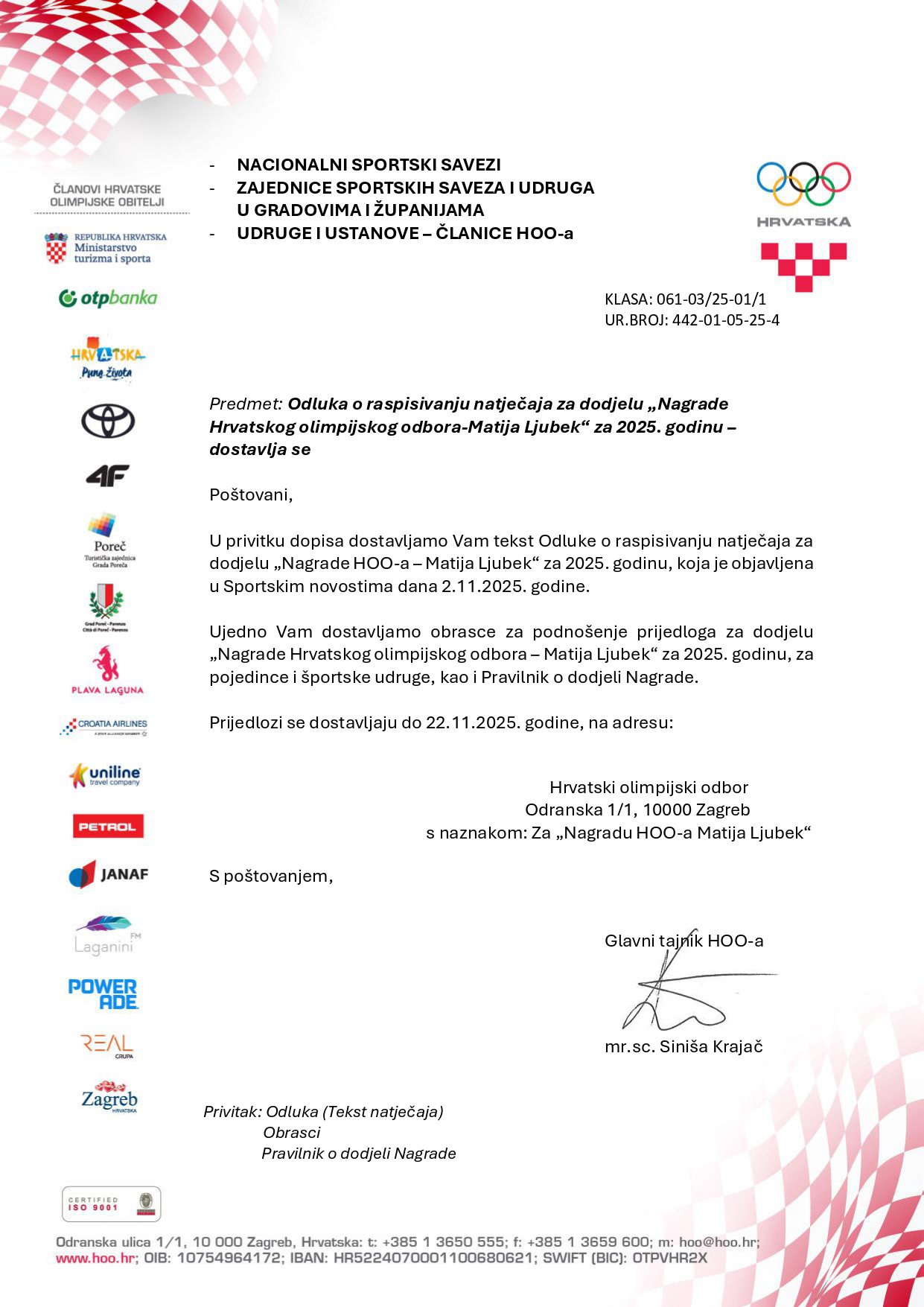 Hrvatski olimpijski odbor (HOO) raspisao je natječaj za dodjelu Nagrade "Matija Ljubek" za 2025. godinu. Objavljen je 2. studenoga u Sportskim novostima, a kandidature se primaju do 22. studenoga.